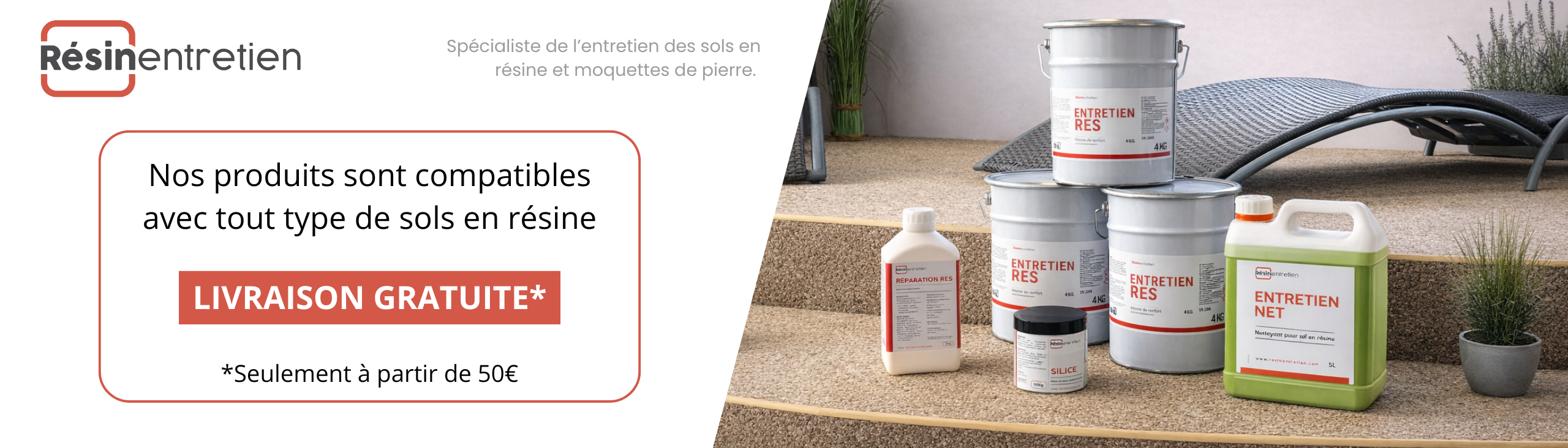 Protection de vos sols en résine Résine d'entretien Protège votre revêtement de sol des intempéries et offre une haute résistance à l’abrasion et aux rayures. Pot de 4kg = 25m2 L'anti-dérapant pour vos plages piscines ou terrasses Solution anti-dérapante 19,90€ Pour réparer votre sol en résine Résine de réparation 94,90€ Nettoie votre moquette de pierre Nettoyant sans solvant Solution professionnelle sans odeur, avec ou sans rinçage et sans COV, idéale pour l’entretien de vos moquettes de pierre. 5L = 40m2 Paiements en ligne sécurisés Nous acceptons les paiements avec la plupart des cartes bleu. Assistance téléphonique Besoin de conseils ? Appelez-nous du lundi au vendredi de 9h à 17h. Livraison GRATUITE dès 199€ d'achat. Livraisons Colissimo relais, Colissimo domicile avec signature ou DHL Express. Compatible sur tout type de sol en résine. L'entièreté de nos produits est compatible avec tous types de sols en résine. Entretien moquettes de pierre, comment poser sa résine d'entretien? Meilleures ventes Découvrez nos produits les plus vendus. Voir tous les produits Ajouter au panier Add to wishlist Nettoyant Sols en Résine Nettoyage Available on backorder 79,90€ Ajouter au panier Add to wishlist Résine d’Entretien Monocomposant Prête à l’Emploi Entretien Available on backorder 159,90€ Ajouter au panier Add to wishlist Rouleau à résine Entretien In stock 5,90€ Ajouter au panier Add to wishlist Antidérapant Sols en Résine Entretien In stock 19,90€ Ajouter au panier Add to wishlist Résine de Réparation Entretien Available on backorder 94,90€ Vous avez un projet de sol en résine et moquette de pierre ? Nous vous invitons à visiter le site de notre partenaire VY&CO, spécialiste et leader français.